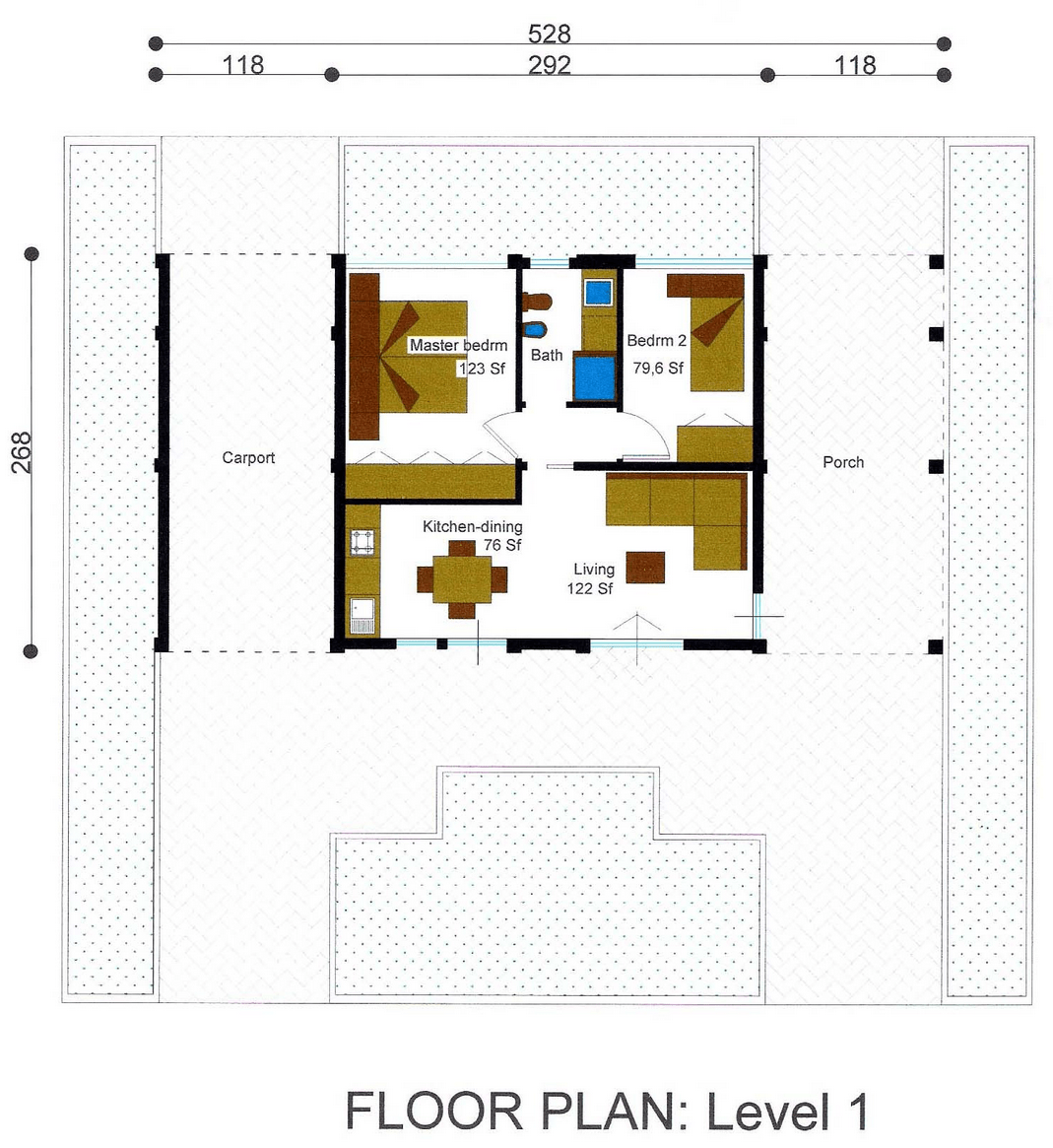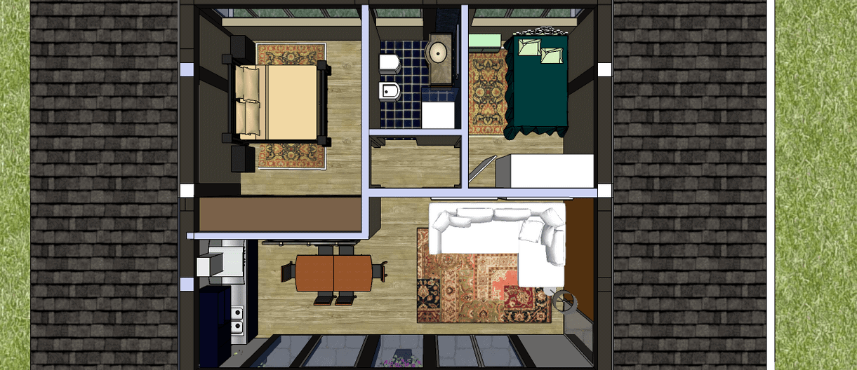 Przykładowe zagospodarowanie. Pamiętaj o dodaniu “sieni” i nie montowaniu okapu na oknie :P