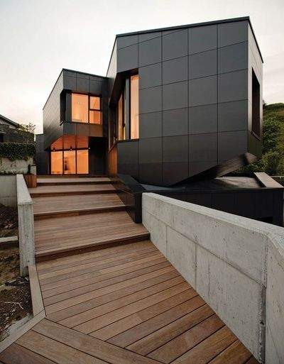 Zwarta forma projektowanego domu + oszczędności energetyczne. Ciekawa okłądzina elewacyjna? Nada każdemu obiektowi nutkę współczesności.