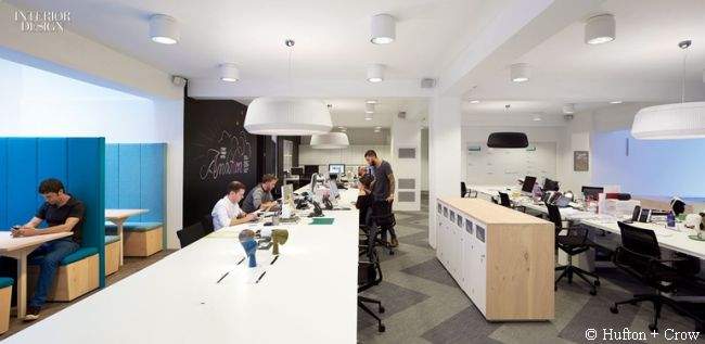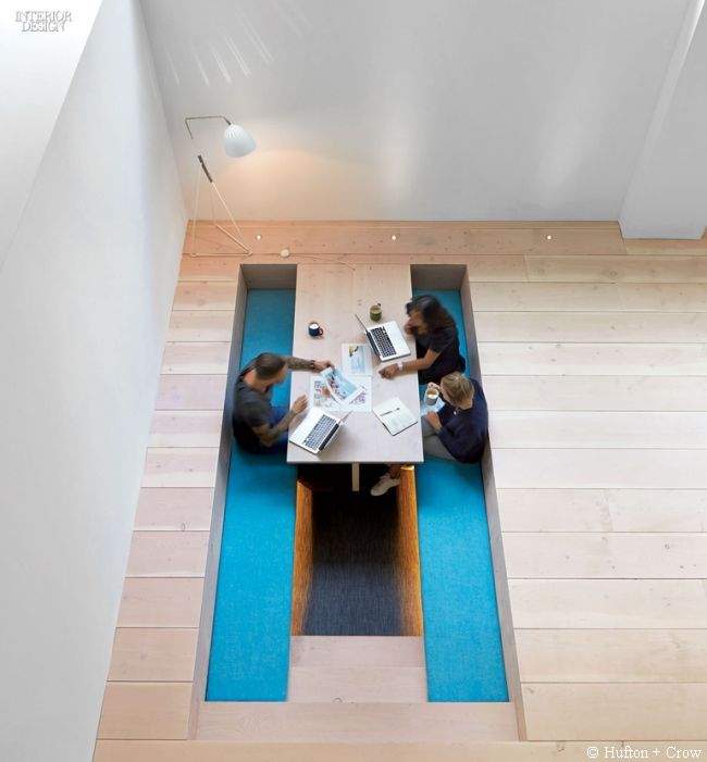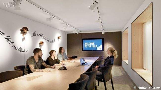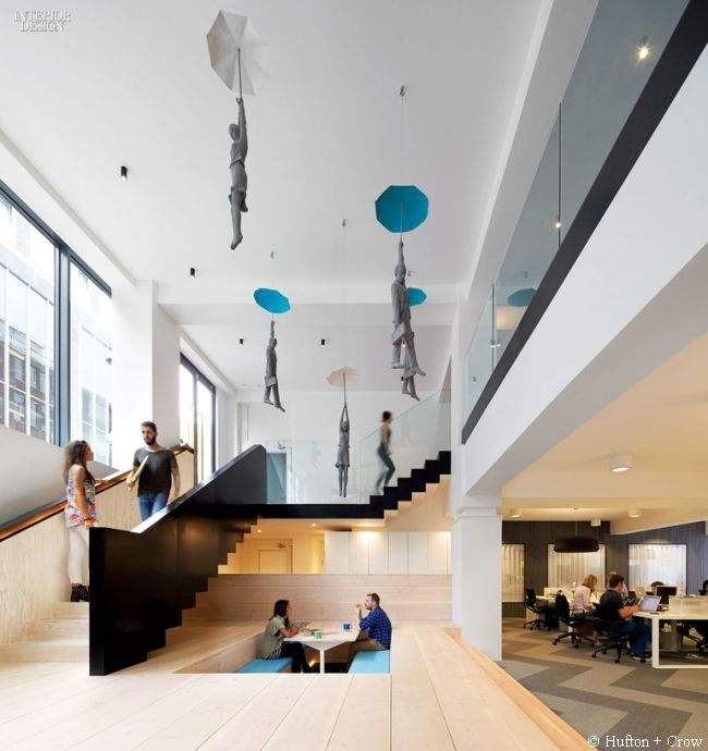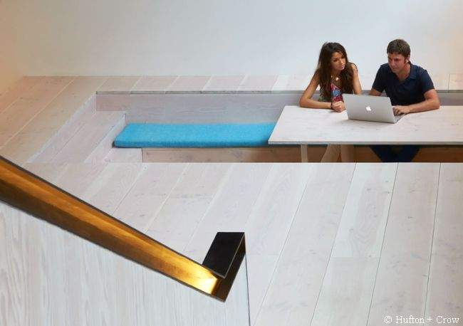 Przestrzeń biura została całkowicie przekształcona przez architektów. Dodano platformę podobną do sceny pomiędzy piwnicą a piętrem, oryginalne siedziska (o których później!), a także stylowe schody. Wszystko razem tworzy modernistyczno-artystyczną mieszankę. Zdecydowanie dominuje tutaj biel, a akcenty kolorystyczne są idealnie dobrane. Czasami odnosi się także wrażenie, iż przebywa się w hotelu – dość nietypowe uczucie, zważając na to, iż jest to agencja reklamowa.