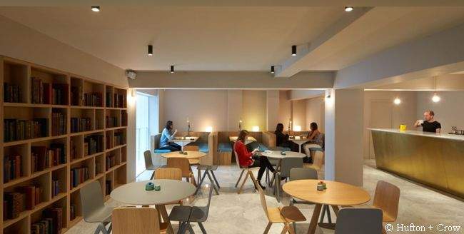 Wnętrza wyróżniają się niesamowicie przytulnym klimatem. To wszystko głównie za sprawą domowych mebli i nieco staroświeckim pomyśle na biblioteczkę. Natomiast nowoczesnego charakteru w innych pokojach nadają neonowe grafiki. Schody, o których wspomniałam wcześniej, wznoszą się przez trzypiętrowe atrium. Pierwsze piętro – efektowne szklane wyjście; drugie – recepcja; trzecie – kawiarnia z uroczą biblioteką. A tam już ukryte są drzwi, które prowadzą do kolejnej imponującej sali. Czarna dębowa podłoga, jasnoszare panele akustyczne – i wreszcie ostatnia ściana budynku.