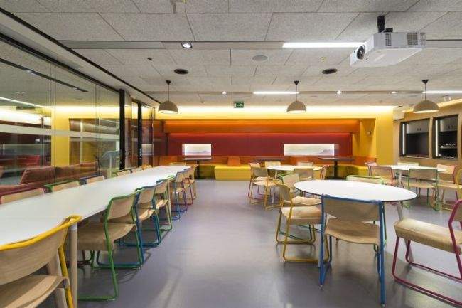 Pierwsze rzeczą, na jaką zwracamy uwagę, oglądając realizację siedziby Google w Madrycie to niesamowita feeria różnorodnych kolorów, akcentów barwnych, w połączeniu z prostymi figurami i nieskomplikowanymi kształtami.