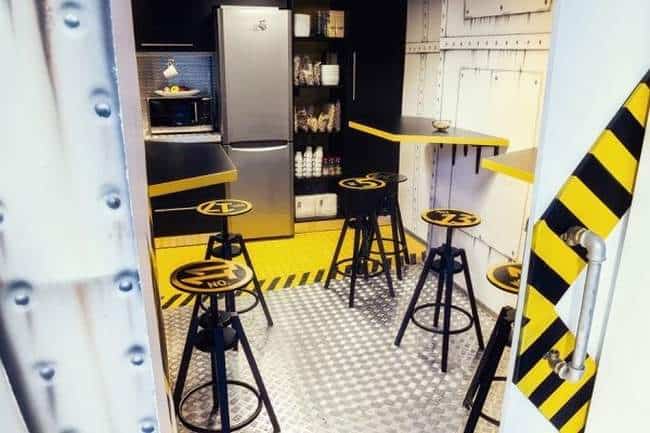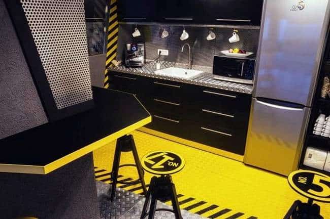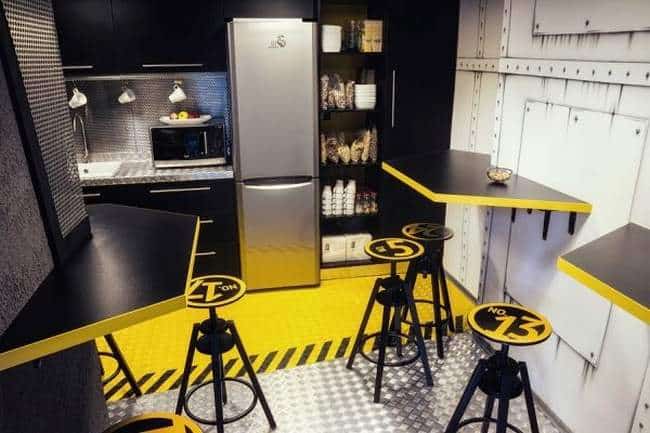 Kuchnia Zobacz jak wygląda kuchnia w tym nietypowo urządzonym biurze! Kuchnia jest niewielka, jednak bardzo dobrze zagospodarowana, są nawet niewielkie stoliki pozwalające spożyć szybki lunch czy ciepły posiłek. Stylistka oczywiście utrzymana w odpowiednim klimacie ;] żółto-czarne wnętrze aż razi w oczy ;P