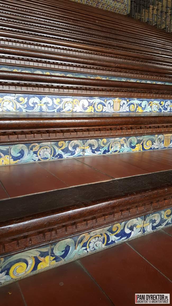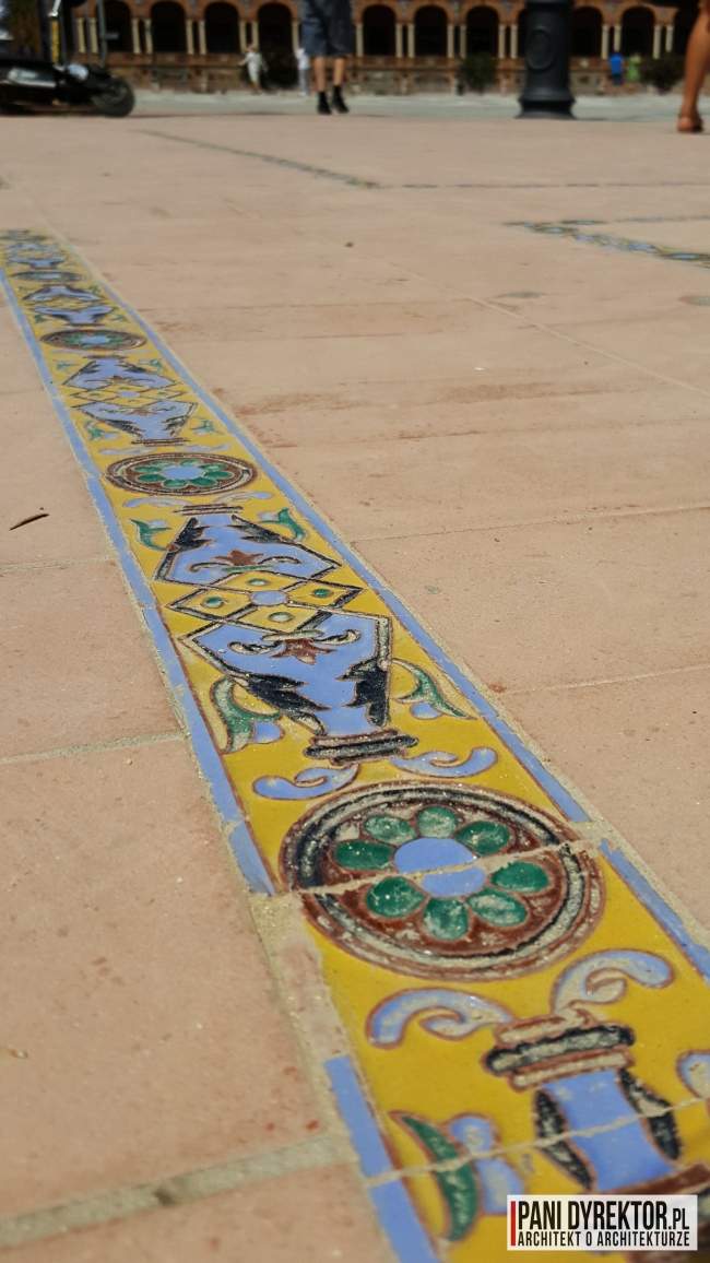 DetaleJeśli chodzi o sztukę ceramiczną, jednym z najbardziej reprezentatywnych miejsc w Sewilli jest Plac Hiszpański (Plaza de España). Reprezentuje on głównie styl neo-mudejar [nowy mauretański lekko orientalny styl pochodzący z XIX w.], zawiera też elementy Art Deco. Główną częścią placu jest 48 miejsc oddzielonych kamiennymi ławkami.