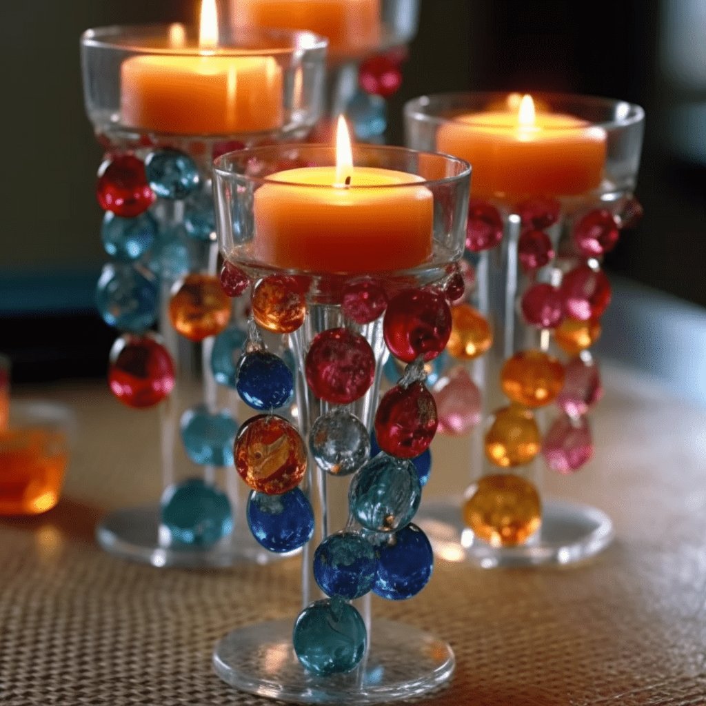 Eleganckie świeczniki z kolorowymi kryształkami i świecami do aranżacji wnętrz, idealne na okazje okolicznościowe i dekoracje stołu, oferowane przez PaniDyrektor.pl.