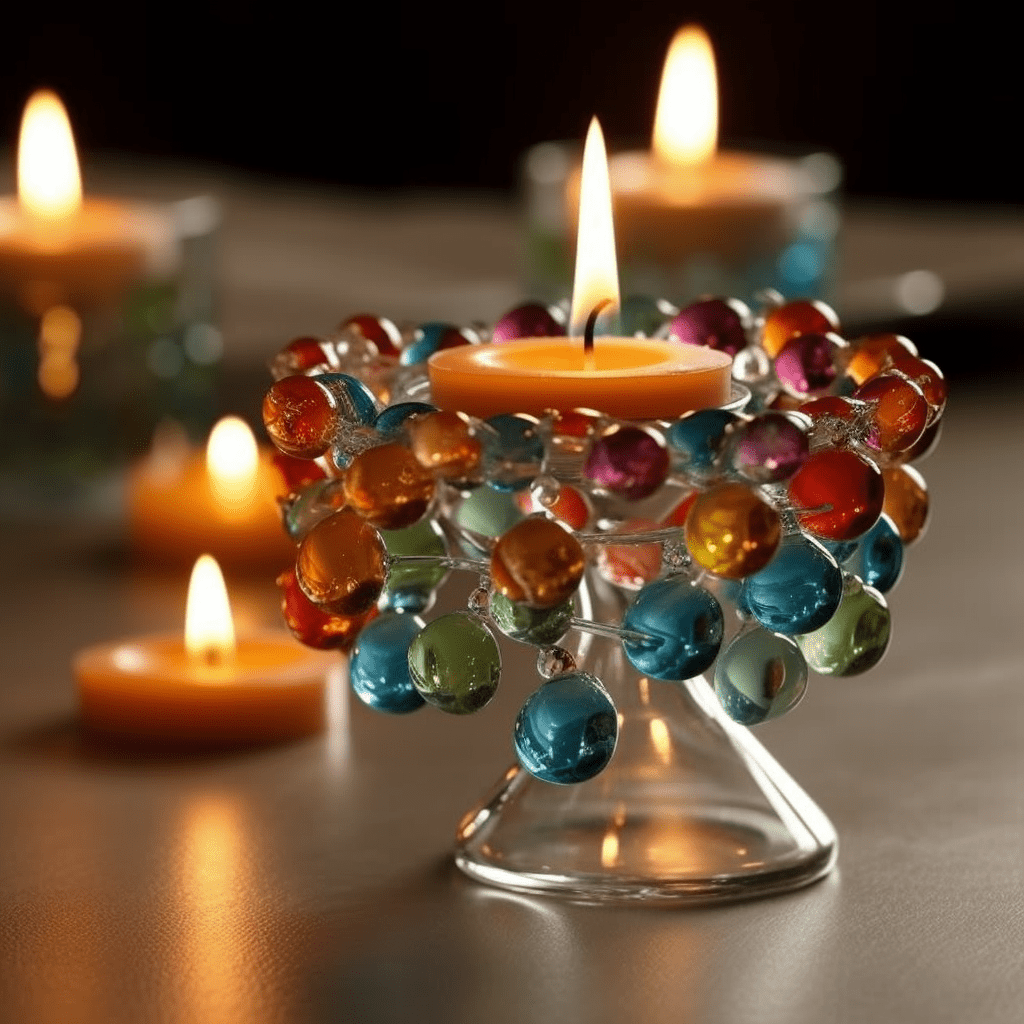 Świeca w kolorowym kielichu z dekoracyjnymi kryształkami, doskonała do relaksu i poprawy energii w przestrzeni domowej czy biurowej.