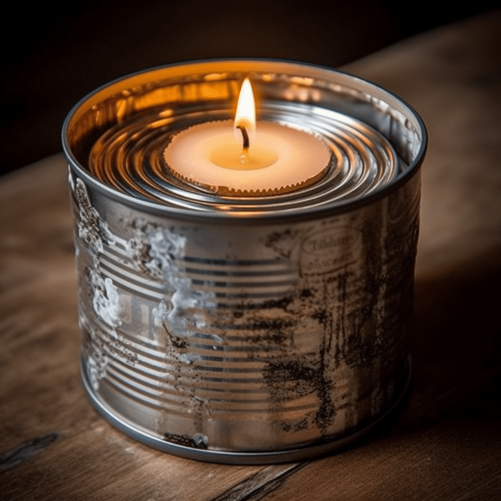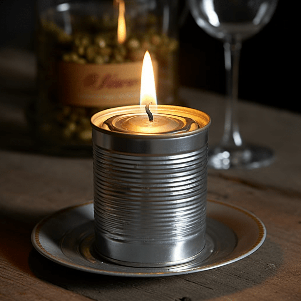 Czarna świeca w puszce z płomieniem, romantyczny nastrój, dekoracja wnętrza na wieczór, elegancka atmosfera, relaks w domu, stylowe oświetlenie, trwała dekoracja, uniwersalny element dekoracyjny, miły wieczór, inspiracja do aranżacji domu.