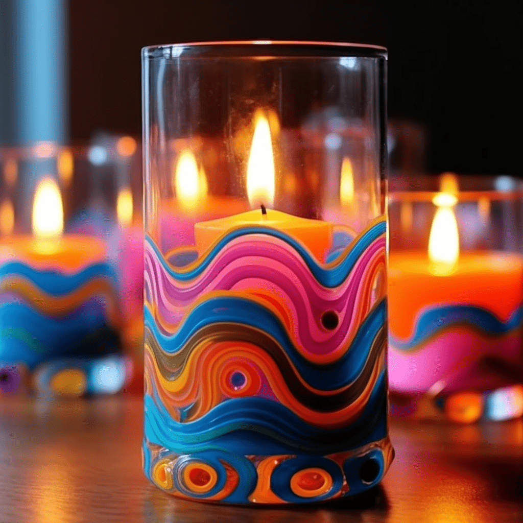 Kolorowe świece w ozdobnym szklanym naczyniu, tworzą ciepłą atmosferę i relaksującą aurę w domu lub na przyjęciu.