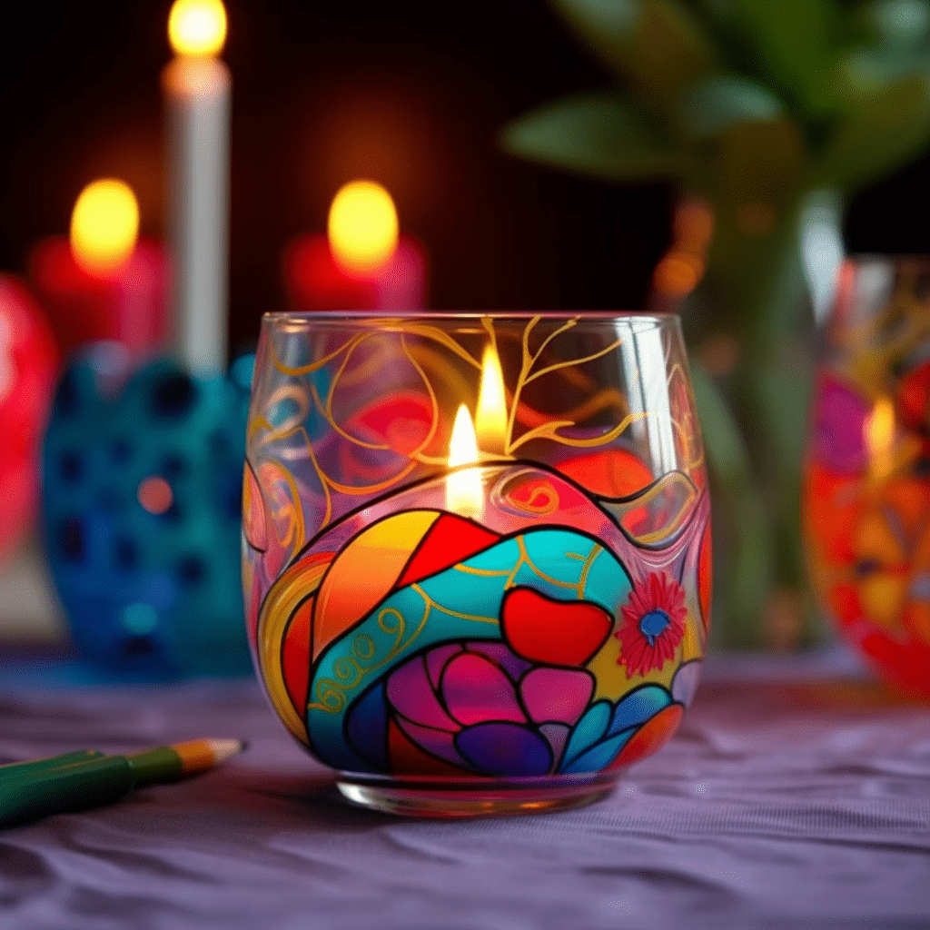 Stwórz przytulną atmosferę z kolorową świecą w ozdobnym szklanym lampionie, idealną na romantyczne wieczory i relaks w domu, z unikalnym, ręcznie malowanym wzorem serca i kwiatów.