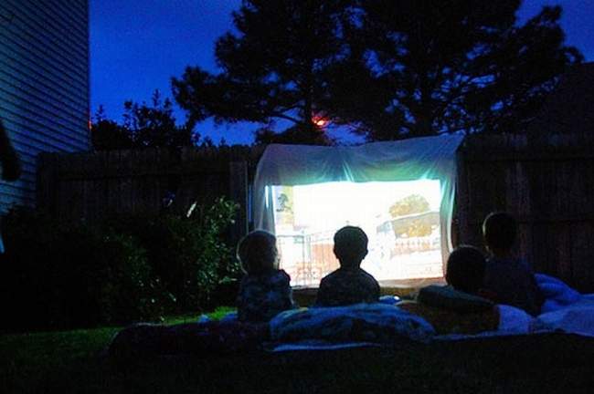 Ekran Na początku posta pokazałam większość inspiracji, w których w stworzeniu ekranu wykorzystano prześcieradła lub inne tkaniny rozwieszone na sznurkach lub rozciągnięte między drzewami. Zobacz jak wykorzystać jedną ze ścian swojego domu (lub domu sąsiada jeżeli masz z nim dobre stosunki;] zawsze możecie wspólnie zorganizować sobie kino plenerowe ;]) i to na niej rzutować film. Ważne, aby ściana była bez faktur czy przegród zewnętrznych jak okno czy drzwi. Jeżeli jednak szukasz obrazu o wysokiej jakości – zainwestuj w dobry ekran i zawieś go na ścianie.
