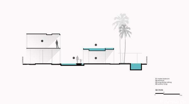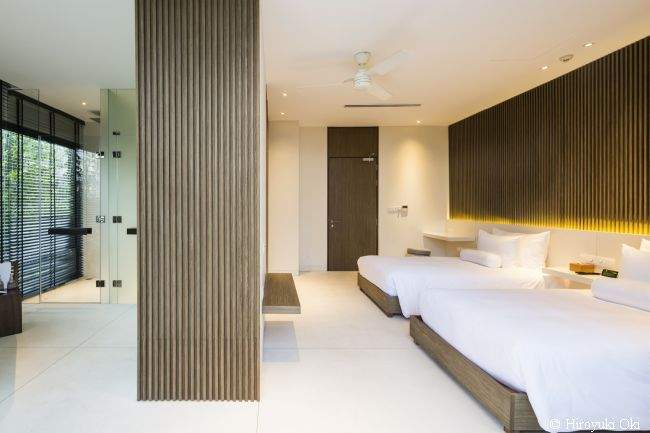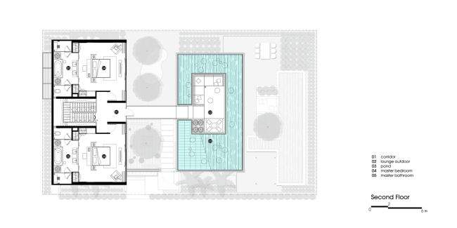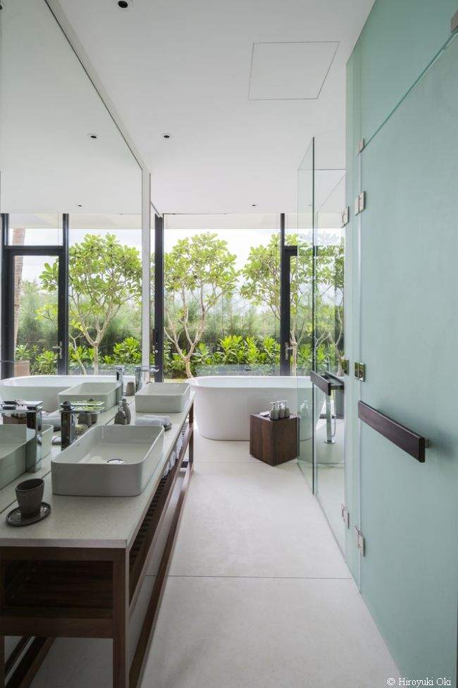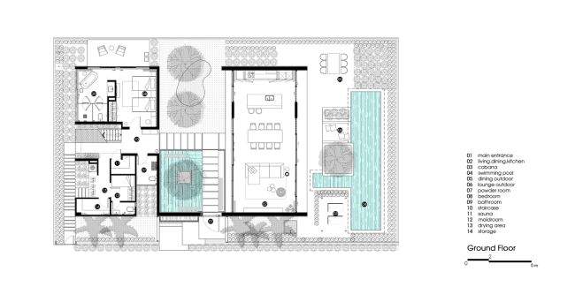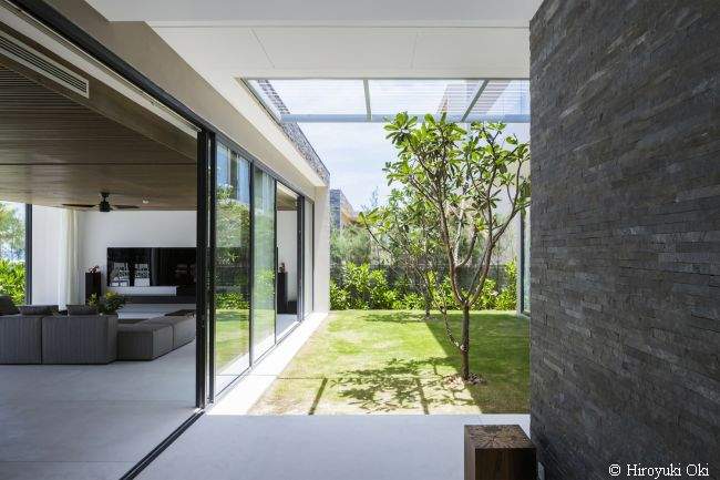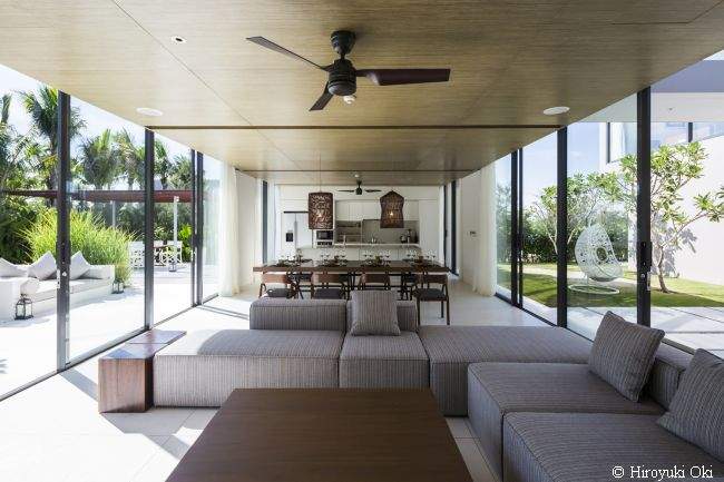 Projekt rezydencji nie jest wybitnie skomplikowany, ale za to dogłębnie go przeanalizowano. Garden Villa to willa przestrzeni – na każdym kroku wyraźnie odczuć można spokój, harmonię i ten specyficzny klimat, który panuje wyłącznie nad wodą ;] Dodatkowo, aby jeszcze lepiej spełniała ona swoje funkcje, ogromną przestrzeń domu podzielono na dwie części. Jedna z nich skupia się głównie na relaksie, odpoczynku i spotkaniach z najbliższymi – “otwiera się” na plażę. Druga, natomiast, jest strefą bardziej funkcjonalną.