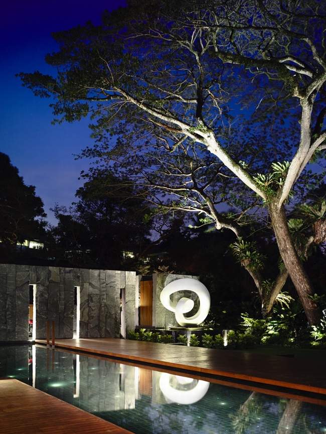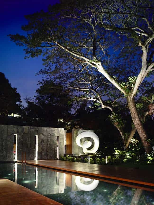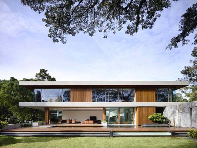 Ten ekskluzywny dom to projekt biura architektonicznego ONG&ONG. Głównym założeniem projektantów było wykorzystanie potencjału, jaki niosło ze sobą sąsiedztwo niesamowitej zieleni i okolicznych drzew, na które dom się otwiera, z którymi się łączy i które dopełniają go jako projekt. Zobaczcie jak zastana zieleń wpływa na odbiór budynku i zastanówcie się, czy czasami warto wykarczować całą działkę z drzew przed rozpoczęciem budowy. Zapraszam Was do inspiracji tej luksusowej rezydencji!