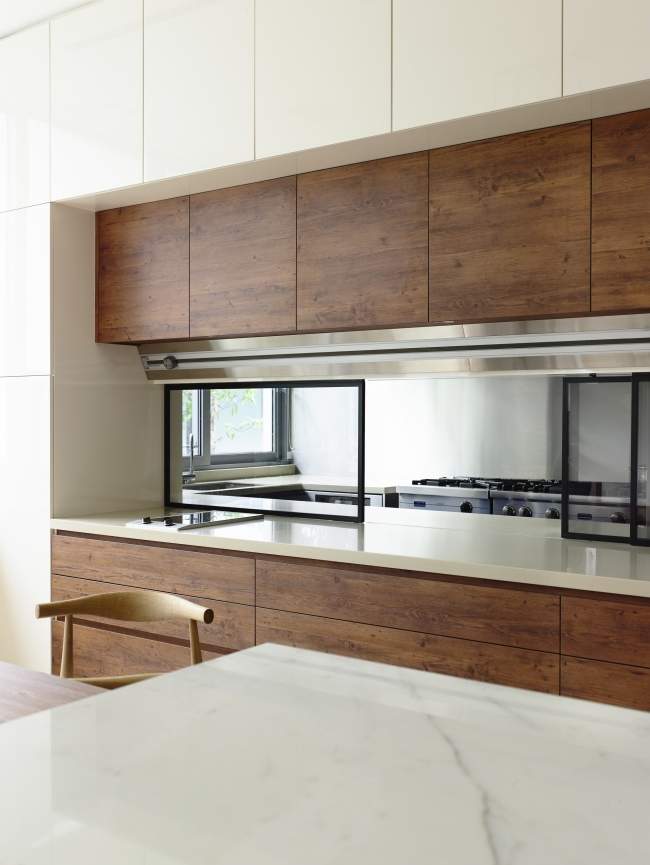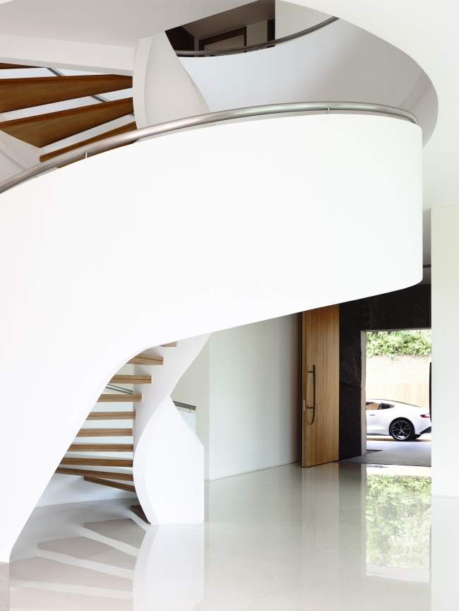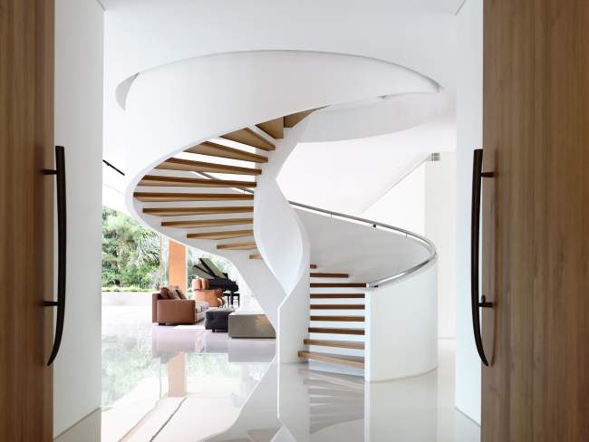 Nowoczesny design wnętrza i elementy wyposażenia współgrające ze sobą i stanowiące całość. Salon otwarty na zewnętrze domu. Zainspiruj się!Nowoczesny design schodów i do tego to rozwiązanie materiałowe, które w luksusowych rezydencjach pojawia się bardzo często – biel poręczy i konstrukcji schodów i drewniane stopnie.W podobnym stylu, połączenia bieli i drewna we wnętrzu, urządzona jest również kuchnia. Ten design jest jednocześnie elegancki, czysty i stonowany jak i przytulny, ciepły i przyjemny – to oczywiście zastosowania naturalnego drewna.Cały budynek dzięki swojemu otwarciu na zieleń i nowoczesnym, naturalnym materiałom wykończeniowym jest bardzo… naturalny! Również łazienka, gdzie zastosowano drewno i kamień, Zwróćcie uwagę na nowoczesny, nietypowy design umywalki.Przestrzeń dzielona szkłem to przestrzeń otwarta, gdyż szkło to bardzo delikatna przegroda, która nie zaburza wnętrza.Piękna, stylowa i bardzo elegancka sypialnia – drewno, biel i ciemne elementy wyposażenia świetnie się komponują. Plus oczywiście za duże przeszklenie, które zapewnia jasne wnętrze.