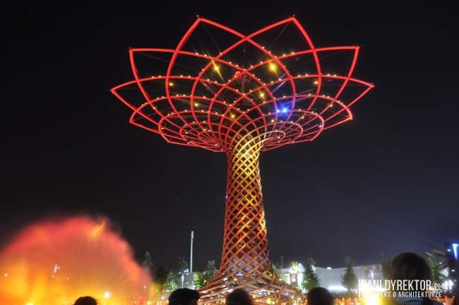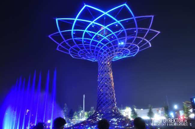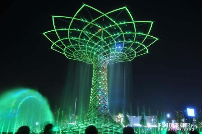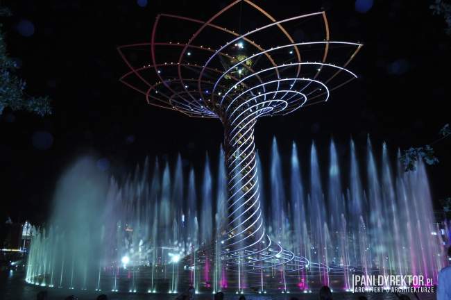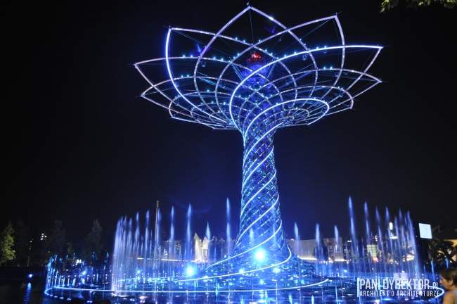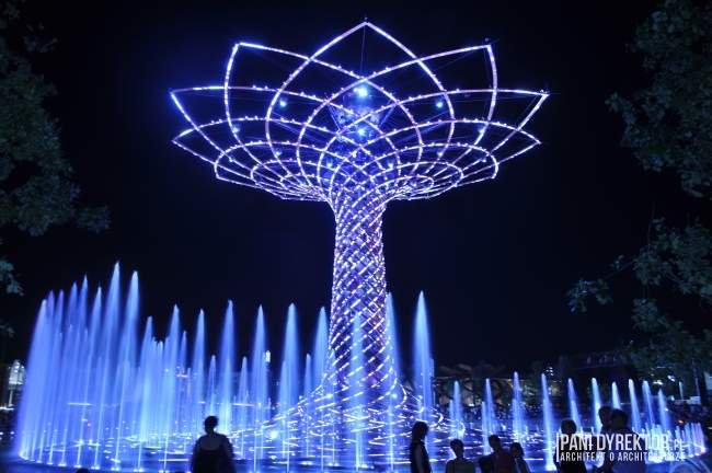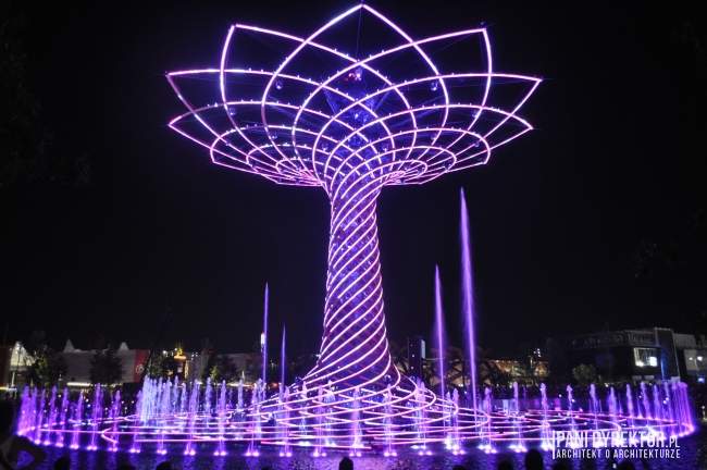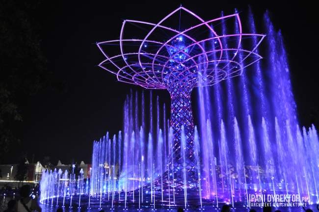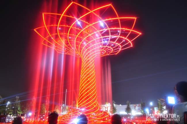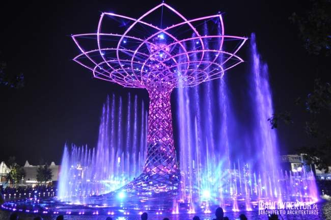 10. Fontanny Nie raz już z okazji wystawy budowane były wspaniałe fontanny. Na jeziorze Lake Arena “rośnie” drzewo ze stali i drewna klejonego okraszone światłem, wodą tryskającą z fontann, otoczone nagłośnieniem, z wyrzutniami fajerwerków zamontowanymi w konstrukcji – Tree of Life. Odbywają się tam co pół godziny pokazy (dzienne i wieczorne). Jeśli macie ochotę na zgłębienie tajemnicy “skąd na Expo takie olbrzymie pokłady wody” – poczytajcie o kanałach regionu Lombardii)