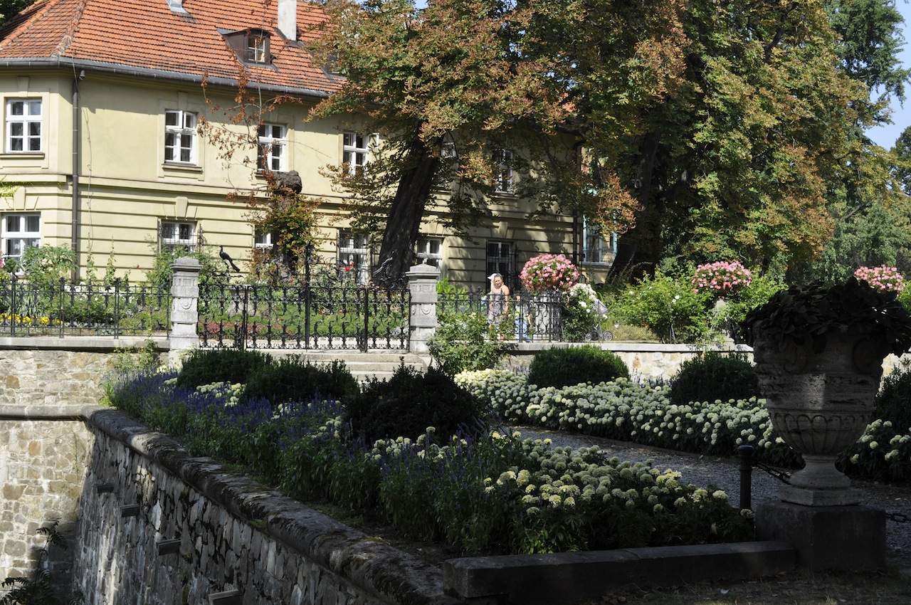 Atrakcyjny ogród w otoczeniu historycznej architektury, z różnorodnymi roślinami i kwiatami, tworzący spokojną przestrzeń do spacerów i relaksu w otoczeniu natury.