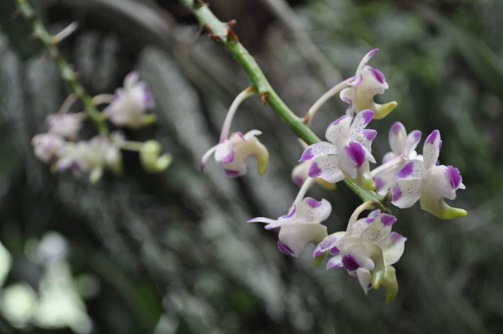 Kwiat orchidei epifitowej z białymi i fioletowymi plamkami na tle zielonych liści i roślin tropikalnych, idealny dla miłośników natury i roślin egzotycznych.