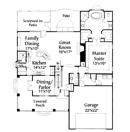 “E” Rzut parteru, a w nim – dwustanowiskowy garaż dostępny z domu, dużą przestrzenią dzienną i sypialnią “gościnną”