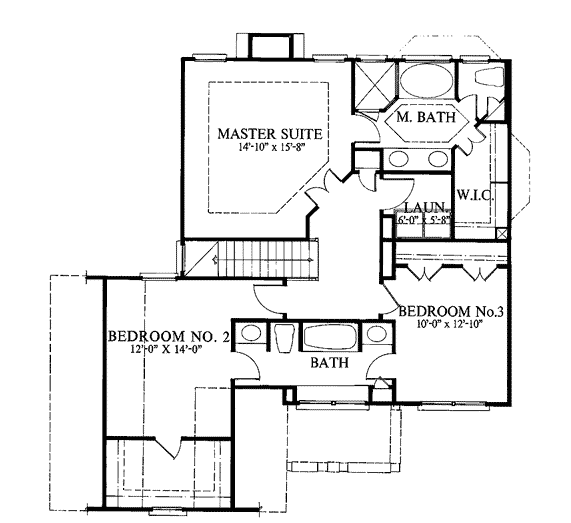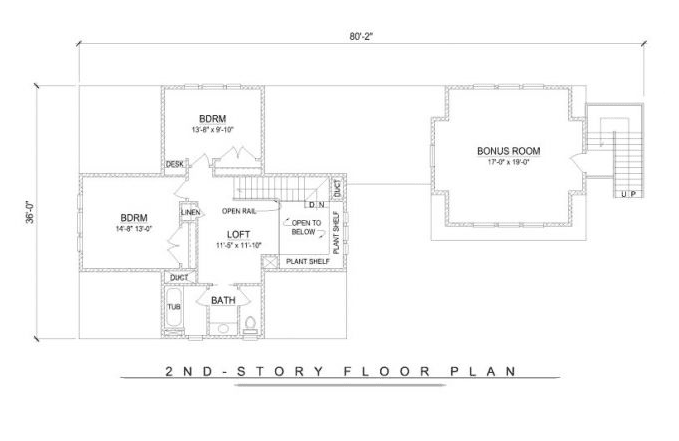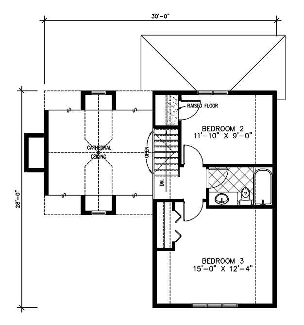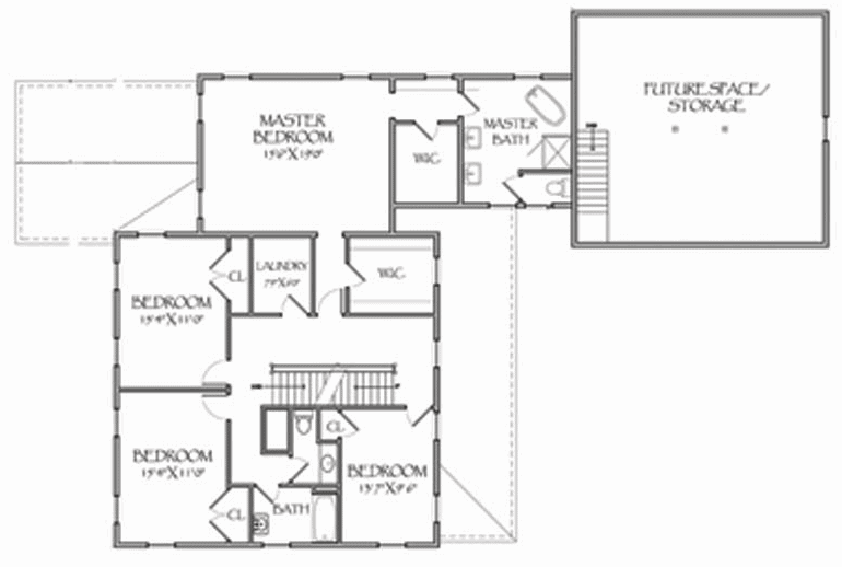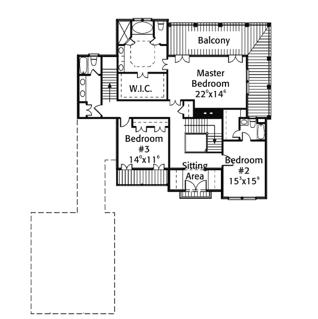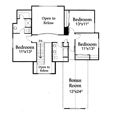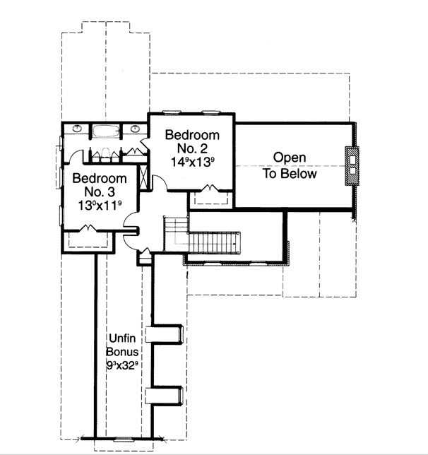 “F” Rzut poddasza. Amerykanie lubią dostęp do łazienek bezpośrednio z sypialni. Salony często zostawiają “otwarte” do parteru. To dlatego mają takie duże przestrzenie! Zobacz – klatka schodowa również nie jest zamurowana!!