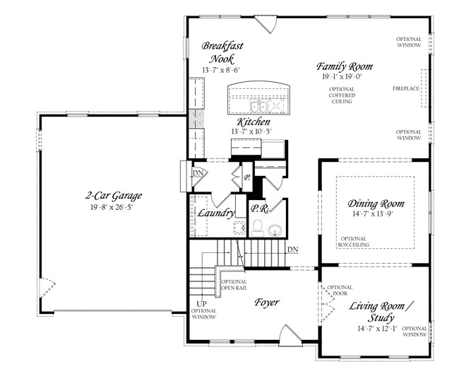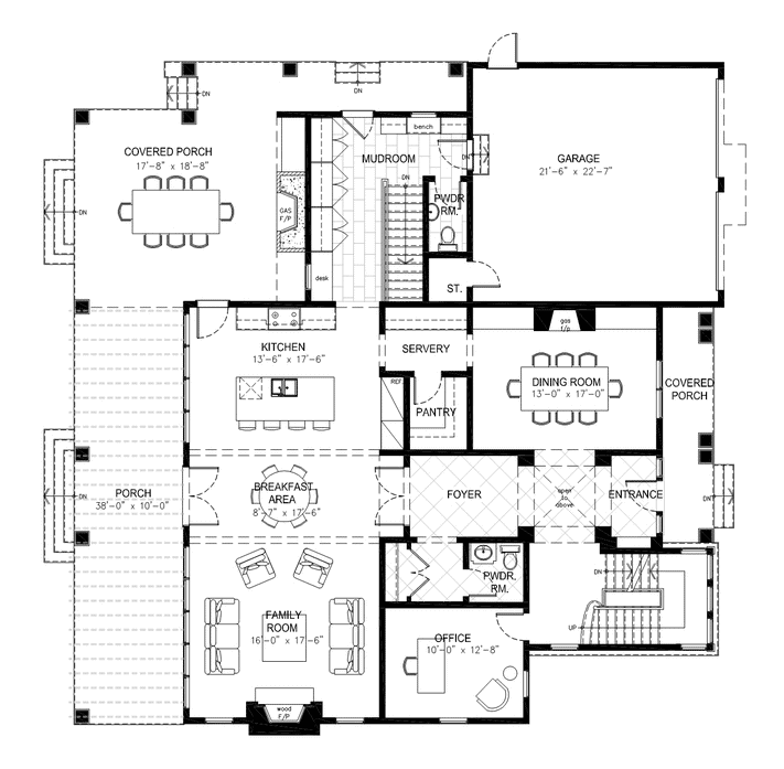 “F” Rzut parteru. Garaż w amerykańskim domu zawsze jest dwustanowiskowy i połączony z pomieszczeniami gospodarczymi stanowiącymi bufor przestrzeni chłodnej i ciepłej. Amerykanie nie boją się również pomieszczeń przejściowych. Zastanów się! Nie ma nic smutniejszego niż “zadrzwiowany” długi i smutny korytarz