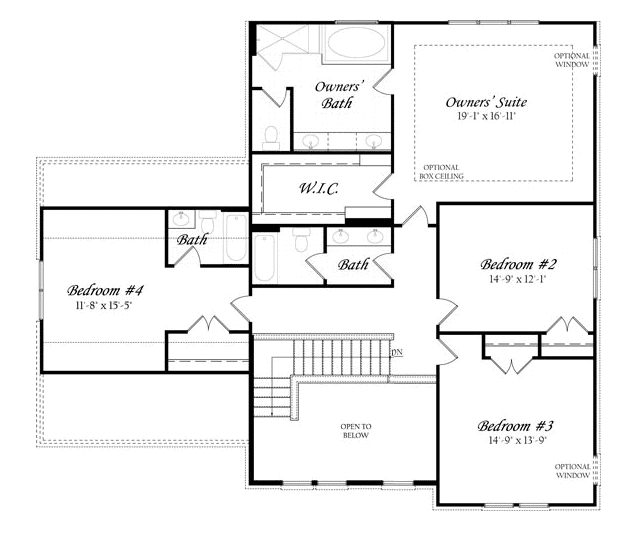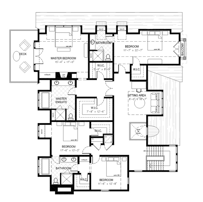 “E” Rzut poddasza z trzema sypialniami, trzema łazienkami i “parapetem do siedzenia”