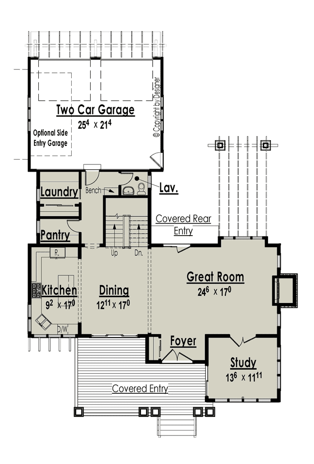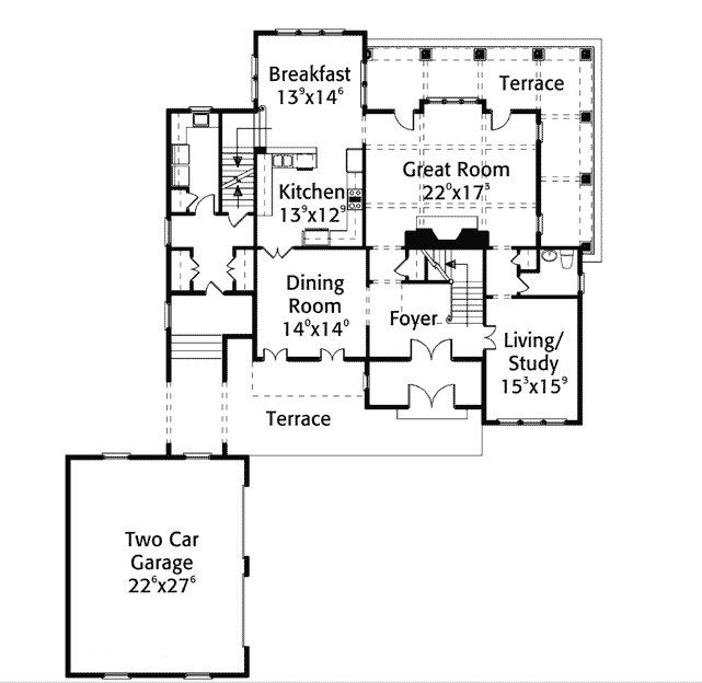 “B” Rzut parteru – Spory dom z dwu-stanowiskowym garażem oraz zewnętrznymi schodami do pomieszczenia “dodatkowego” nad garażem (np. biuro).