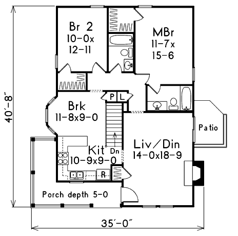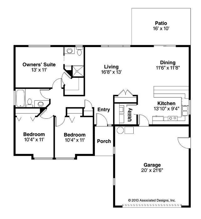 Niewielki parterowy dom – rzut. Duży aneks kuchenny z salonem i wyjście na patio. Rozdzielone wyraźnie funkcje.