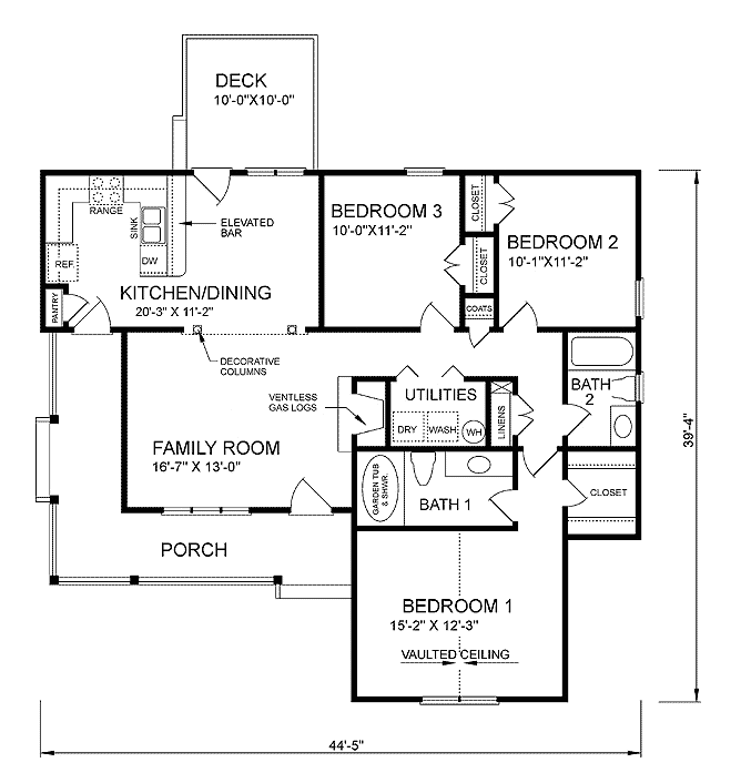 Parterowy, spory dom z trzema sypialniami i dwiema dużymi werandami. Warte uwagi – oddzielenie sypialni “rodziców” od sypialni “dzieci”