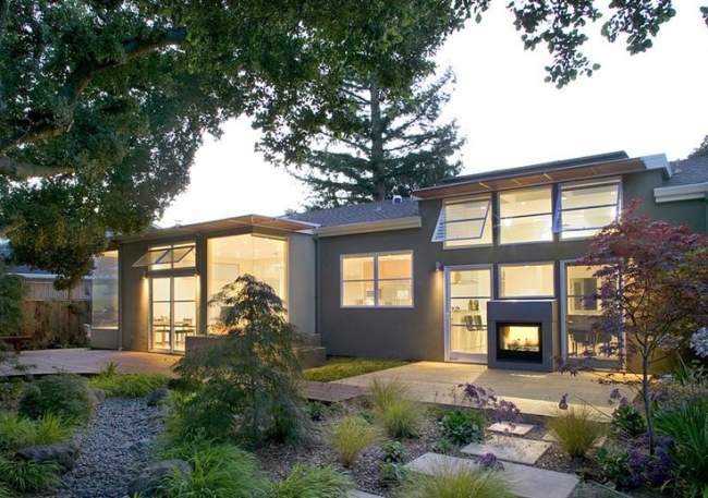 Nowoczesny dom z dużymi oknami i kominkiem w otoczeniu zieleni, idealny do życia w komfortowych warunkach z pięknym widokiem na ogród.