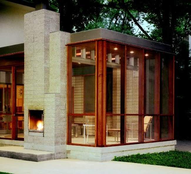 Indoor/Outdoor Taki kominek można zaaranżować miedzy jakimś pomieszczeniem w domu a tarasem. To ciekawe usytuowanie pozwoli cieszyć się jego estetyką i ciepłem w chłodne dni. Na zewnątrz można zbudować palenisko, podłączając do tej samej wentylacji co wewnętrzny kominek. Wówczas można je wykorzystać jako ognisko lub ruszt. Same plusy z takiego kominka ;]