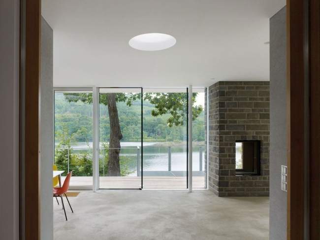 Nowoczesny salon z panoramicznym widokiem na jezioro, wyposażony w funkcjonalny kominek i minimalistyczny design, tworzy idealne miejsce do relaksu i pracy zdalnej.