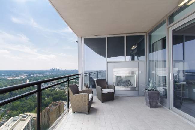 Ekstra balkon z panoramicznym widokiem na miasto, wygodnym miejscem do wypoczynku i nowoczesnym kominkiem, idealny dla miłośników relaksu wśród wysokich budynków.