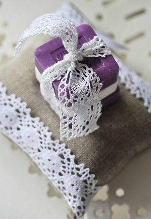 MODERNY, elegancki prezent na różne okazje, ozdobiony delikatną koronką i fioletową wstążką, podkreślający wyjątkową atmosferę świąt i celebracji.