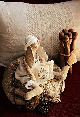 Urocza dekoracja na kanapę przedstawiająca zajączka z materiałowych skarpet, otoczona poduszkami i naturalnymi elementami, w ciepłych tonacjach, dodająca przytulności i charakteru wnętrzu.