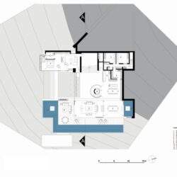 Budynek o spójnej formie posiada przestronne i lekkie, nowoczesne wnętrze. Ta luksusowa rezydencja powstała poprzez projektowanie formy, samej bryły. W projekcie wnętrza architekci również skupili się na budynku jako na całości, nie na detalach i poszczególnych jego elementach. Takie projektowanie daje wnętrzu dużo przestrzeni – pomieszczania otwarte są jedno na drugie a samo wnętrze na zewnętrze – otoczenie budynku.