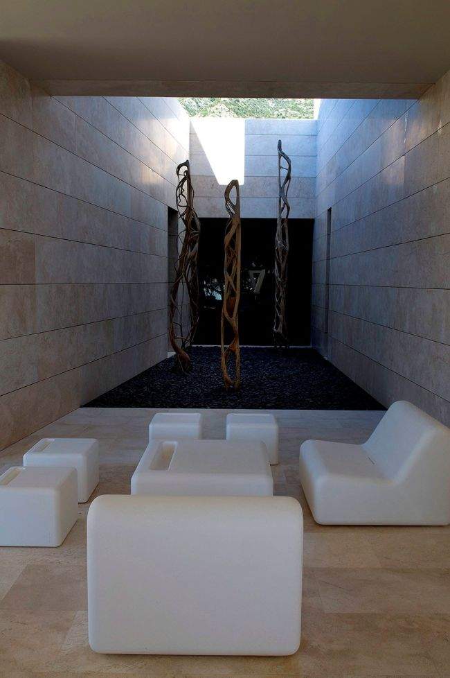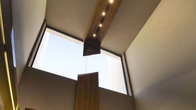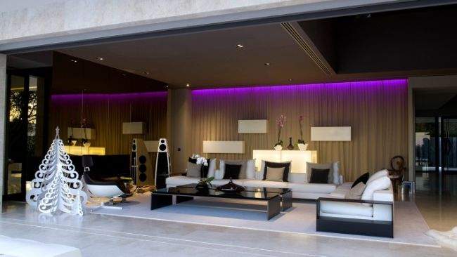 Wnętrze – zaprojektowane zostało w ten sposób, aby pomieszczenia takie jak salon, jadalnia na parterze czy sypialnie znajdujące się na piętrze zlokalizowane były od strony południowej domu, dobrze doświetlone i z pięknym widokiem na zewnętrze i znajdujące się w oddali morze. Południowa część domu otwiera się na zewnętrze i położone w tym miejscu taras, basen, ogród czy kort tenisowy. Zaprojektowane w przyciemniane, ale wielkowymiarowe okna, niekiedy na wysokość kondygnacji, wnętrza pokoi od południa łączą się bezpośrednio z jego zewnętrzem, tak jak zaprojektowane w salonie wielkowymiarowe okno, które chowa się automatycznie w podłodze. Zainspiruj się nowoczesną technologią i nietypowymi rozwiązaniami!