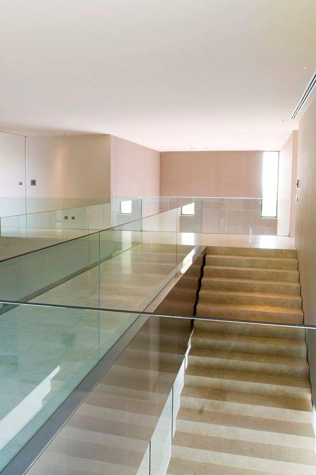 Korytarz wejściowy luksusowej willi z basenem – zwróć uwagę jak czytelny, jasny i przejrzysty jest jego układ.Nowoczesny dom to dom otwarty. Luksusowa willa w Marbella posiada bardzo proste rozwiązania funkcjonalne. Zaprojektowana została w ten sposób, aby mieć duże, przestrzenne wnętrze i dobrze doświetlone pomieszczenia.Nowoczesny design klatki schodowej i połączenie dwóch ultra nowoczesnych materiałów – betonu i szkła.Antresola z widokiem na kuchnię i część jadalną. Przy takim rozwiązaniu pamiętaj o zainwestowaniu w dobry wyciąg kuchenny – docenisz to później na antresoli właśnie.Stylowa i bardzo designerska umywalka. Jej usytuowanie – tuż przy oknie typu port fenetre (okno na całą wysokość kondygnacji) – dodatkowo podnosi jej walory i pięknie ją eksponuje na zewnątrz. Bardzo nowoczesne wnętrze – czarna tafla szkła z wąskim pionowym światłem – zainspiruj się!Nie wiem co to za roślinki? dekoracje? ale wyglądają ekstra! Zwłaszcza przy tym wielkim oknie, przez które widać wodę bezpośrednio sąsiadującą z budynkiem.