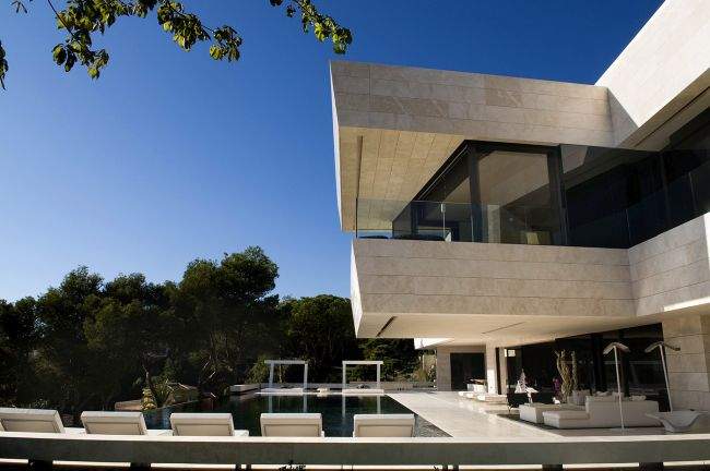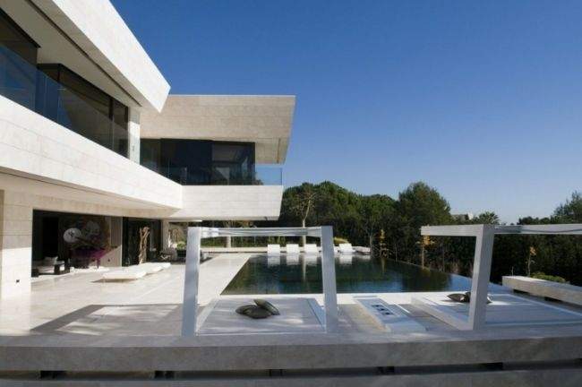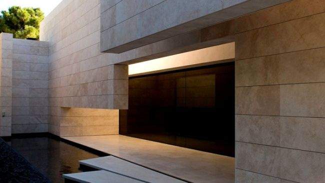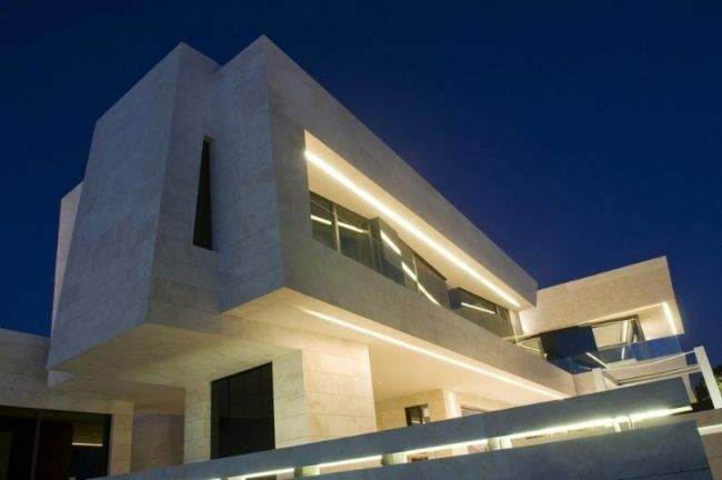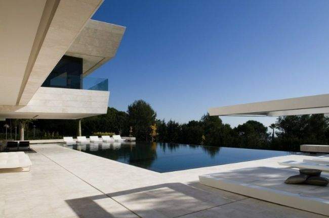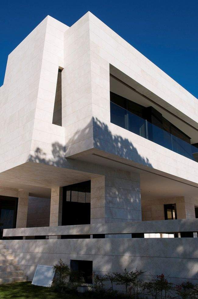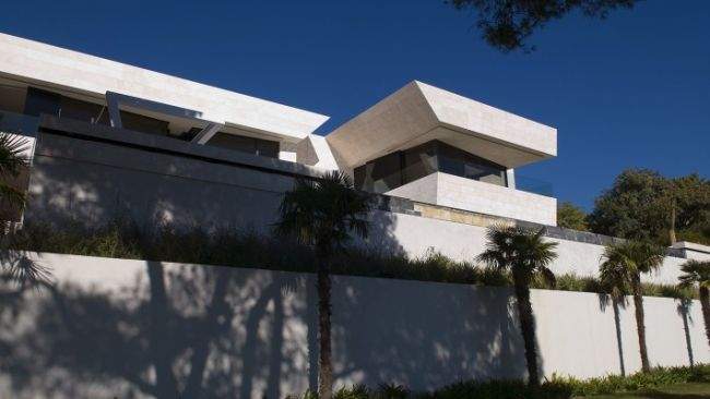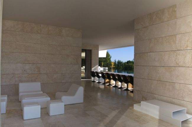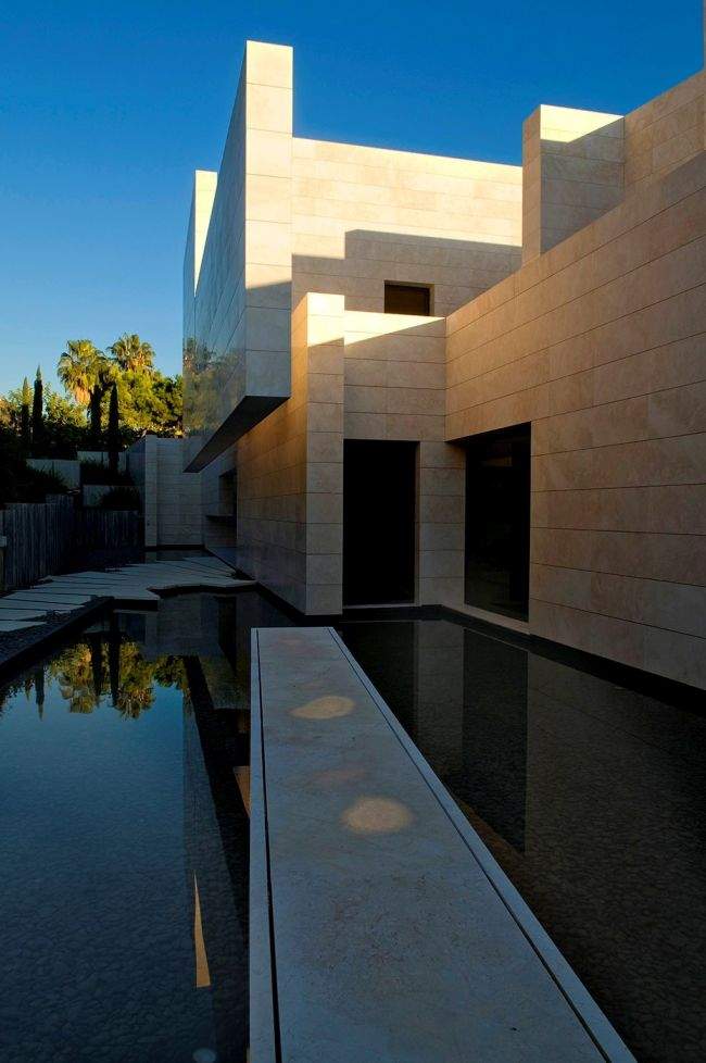 Materiał / Detal Zobaczcie jak rozwiązane zostały elewacje i sama bryła tego nowoczesnego domu – jedynym materiałem, którego użyto w wykończeniu elewacji luksusowej willi w Marbella jest jasny trawertyn. Zestawiony z wielkowymiarowymi oknami i drzwiami o czarnej stolarce i przyciemnionym szkle wygląda fascynująco i tworzy nowoczesny design. Elementy takie jak woda zaprojektowana w bezpośrednim sąsiedztwie domu czy basen dodatkowo podkreślają prosty, oszczędny design bryły tej luksusowej willi w Hiszpanii. Zwróćcie uwagę jak wykonane zostały detale architektoniczne – ciekawe wycięcia, nadwieszenia, ‘wiszące ściany’ – te elementy również wpływają na charakter budynku i jego odbiór!