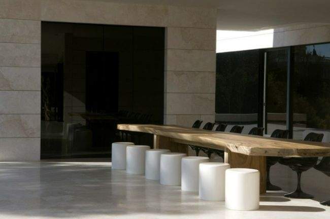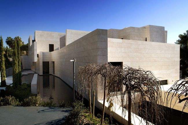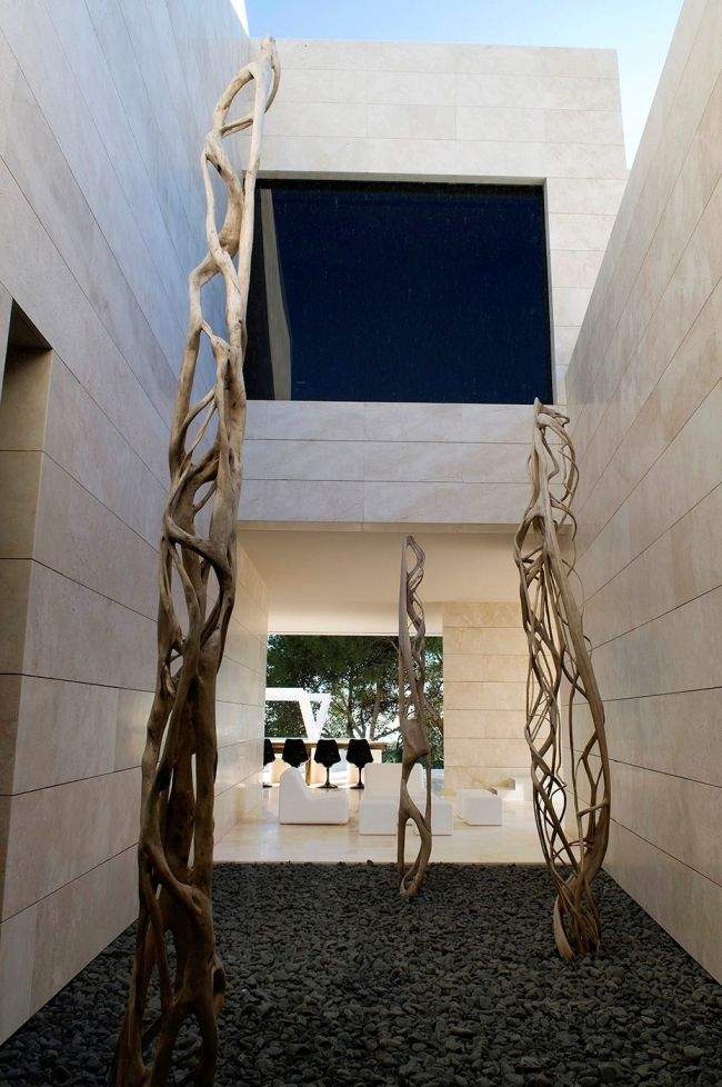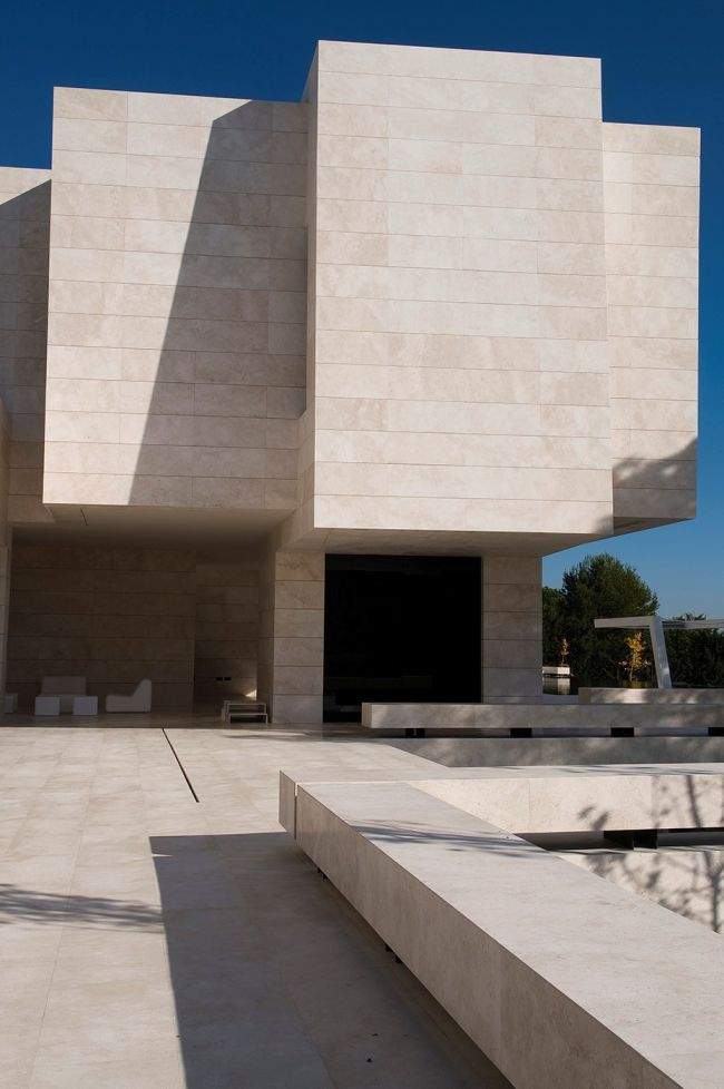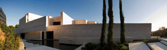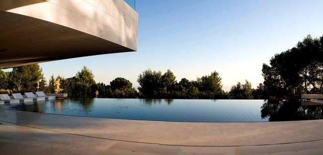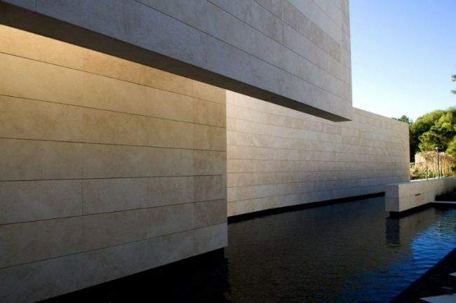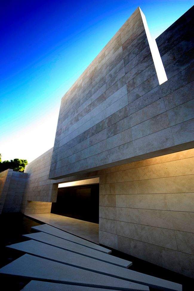 Materiał / Detal Zobaczcie jak rozwiązane zostały elewacje i sama bryła tego nowoczesnego domu – jedynym materiałem, którego użyto w wykończeniu elewacji luksusowej willi w Marbella jest jasny trawertyn. Zestawiony z wielkowymiarowymi oknami i drzwiami o czarnej stolarce i przyciemnionym szkle wygląda fascynująco i tworzy nowoczesny design. Elementy takie jak woda zaprojektowana w bezpośrednim sąsiedztwie domu czy basen dodatkowo podkreślają prosty, oszczędny design bryły tej luksusowej willi w Hiszpanii. Zwróćcie uwagę jak wykonane zostały detale architektoniczne – ciekawe wycięcia, nadwieszenia, ‘wiszące ściany’ – te elementy również wpływają na charakter budynku i jego odbiór!