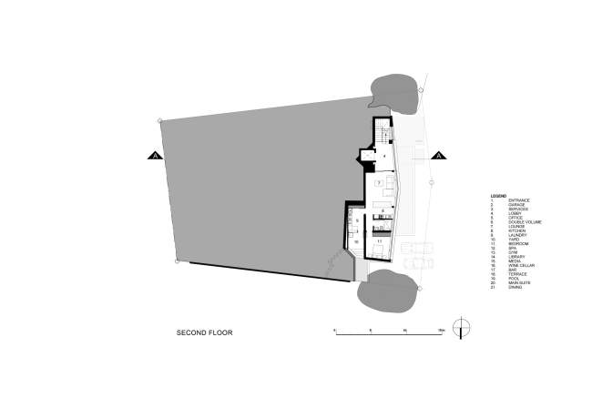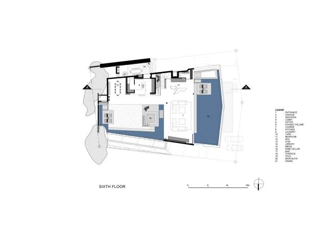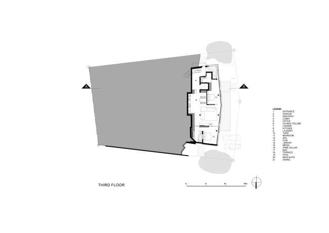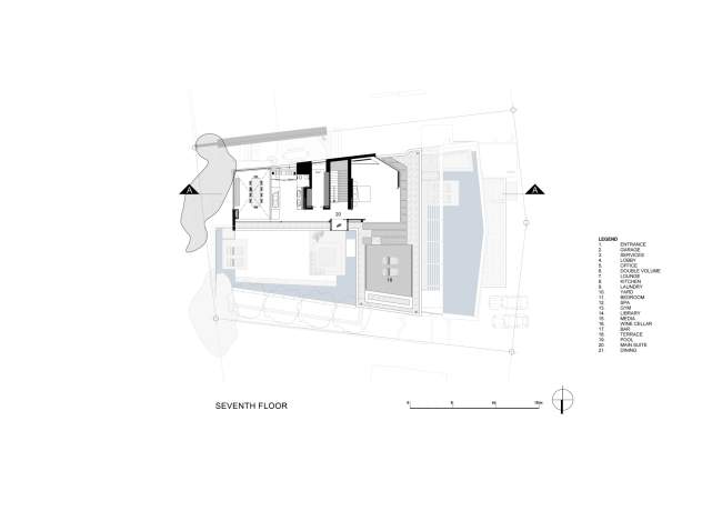 PrzebudowaTa niepozorna przebudowa to jedyne 1200 mkw. projektu. Budynek, jak na luksusowe domy przystało, posiada rozbudowaną funkcję zlokalizowaną na aż siedmiu piętrach mieszczących m.in. sześć sypialni, pokój multimedialny (kino), gabinet, strefę jadalną w kuchni, ‘family room’ czyli mniej oficjalny salon, reprezentacyjny pokój dzienny/salon, jadalnię, pralnię, siłownię, barek winny i bar.