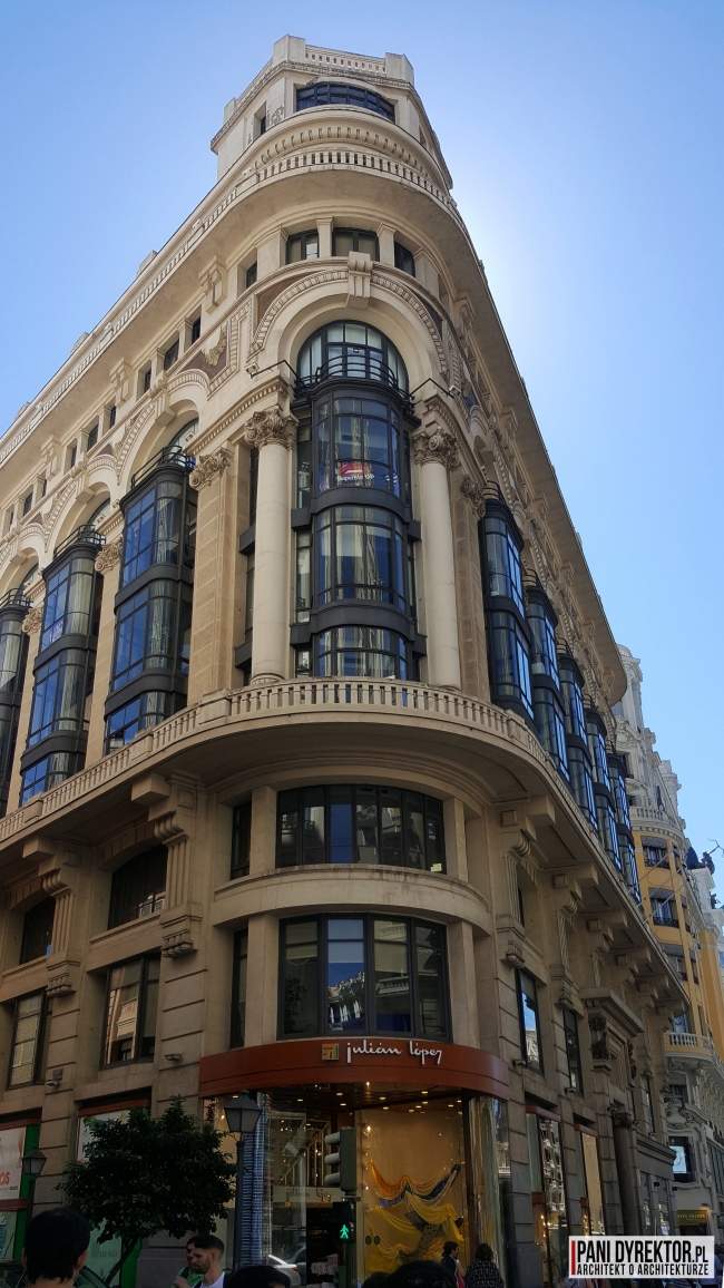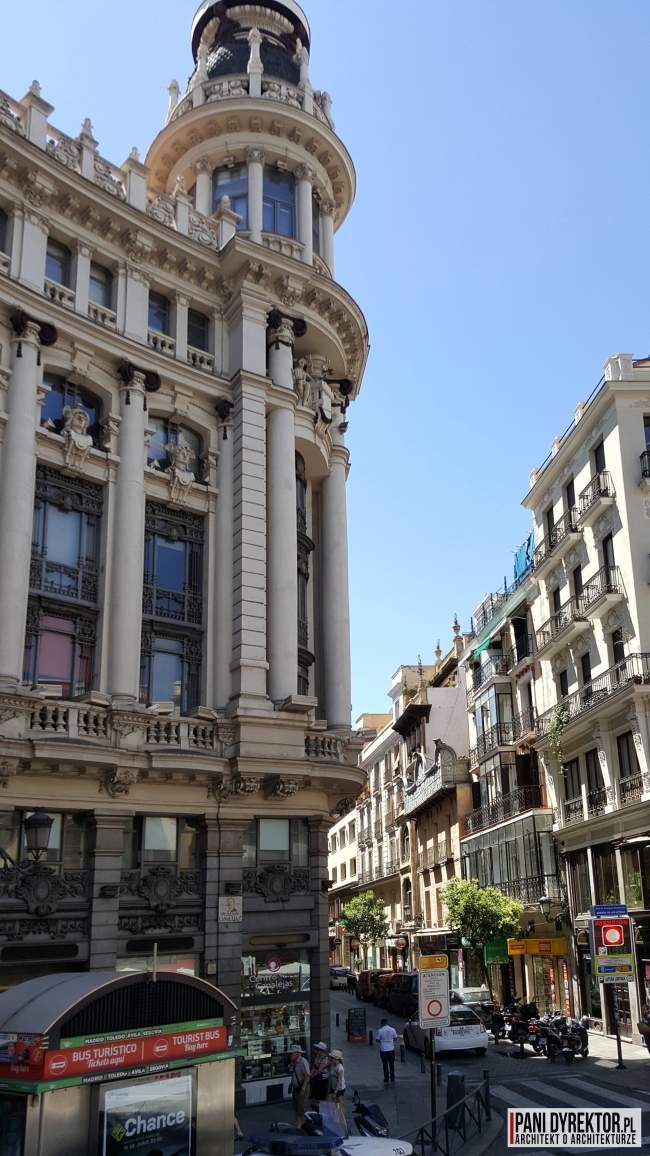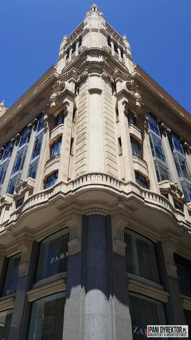 A teraz część, która zainspirowała mnie do napisania tego posta – czyli kilka słów o monumentalności madryckich budynków. Pierwsza rzecz, która od razu przyciąga wzrok to… ich narożniki. Nie żartuję! Szczególnie na ulicy Gran Vía rzadko zdarza się, by bryła budowli była ostro zakończona. Narożniki bardzo często zamienione są na półkoliste, ścięte pod kątem 45 stopni albo wieloboczne. Nie brakuje tu kolumn, pilastrów, balustrad, boniowanych elementów czy sztukaterii w ogóle. Każdy z budynków zdaje się niemal walczyć z innymi o uwagę przechodniów.