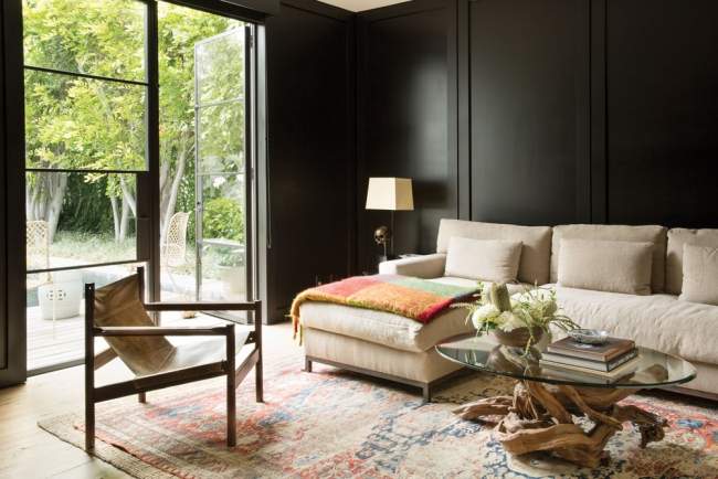 Nie bój się pomieszczeń z ciemnymi, czarnymi ścianami. To wnętrze, przez to że jest dobrze doświetlone, nie jest ponure, a zestawione z jasnymi dodatkami – bardzo eleganckie!