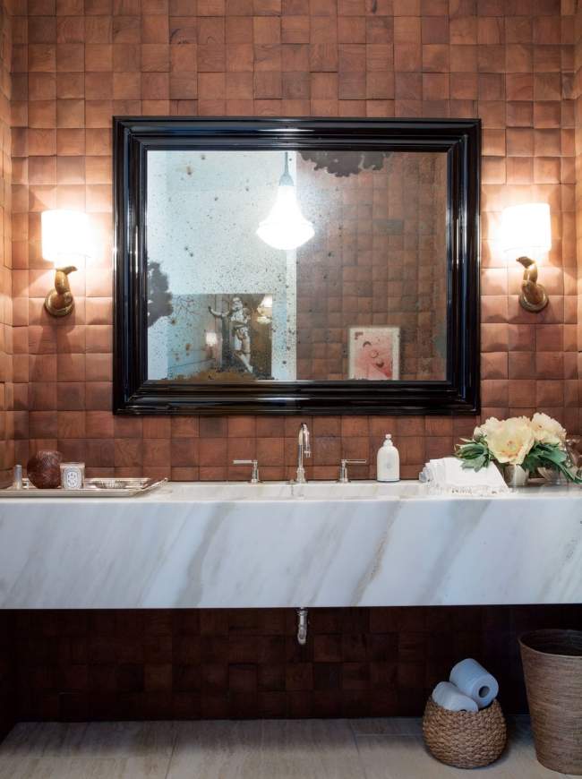 Proste wnętrze łazienki – płytki w kolorze cegły, zestawione zostały z kamiennym blatem i czarną ramą lustra.