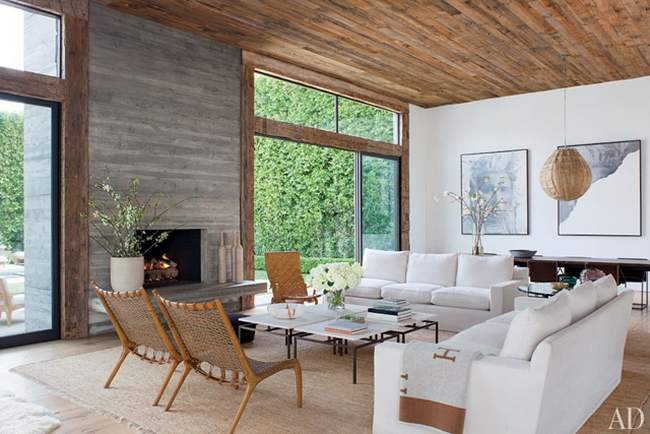 Jenni Kayne w zaprojektowanym przez siebie domu. Zwróć uwagę na materiały jakie zastosowane zostały w wykończeniu domu – drewno i beton przy kominku. Do tego dekoracja z glinianych butli i wazonu – wszystko bardzo stylowe i stonowane. Wszystko idealnie ze sobą współgrające.Widok na wnętrze nowoczesnego salonu. Zainspiruj się prostotą, ciepłym wnętrzem, w którym zastosowano naturalne materiały – tutaj – drewno – na stropie, na podłodze, w formie ram okien.Design kuchni – biała kuchnia to kuchnia bardzo nowoczesna i przyjemna. Zobacz białe wnętrze kuchni – jasne, przestronne, bardzo luksusowe.Piękna szafa z witryną zapewnia doskonały wgląd do środka szafy gdzie schowana została zastawa. Tutaj drewno połączone zostało z bielą ram drzwi szafy.Jeszcze jeden widok na nowoczesną kuchnię – zainspiruj się! Wszechobecne drewno ociepla wnętrze i nadaje mu naturalnego designu.Kolejne drewniane wnętrze – zobacz jak poprowadzone zostały deski – kierunek deski położonej na stropie pomieszczenia przechodzi bezproblemowo na ścianę pokoju – aby wnętrze nie było monotonne wprowadzono jasne dodatki i przyjemne tkaniny.Na poprzednim zdjęciu to pomieszczenie nie wyglądało na takie przestronne prawda? Duże przeszklenia i okna wychodzące na ogród i zieleń to dodatkowy plus. Zainspiruj się czarną stolarką okien w tym wnętrzu!Nowoczesna elegancka łazienka – zobacz jak pięknie została zaprojektowana! Ilu z Was przyszłych Inwestorów zdecydowałoby się na takie przeszklenie, okno w łazience? Zapewne niewielu ;] Świetnie zestawiono tu ze sobą metalową wannę, stanowiącą centrum łazienki, z kamieniem na ścianie, piękną wiszącą okrągłą lampą, czarnymi oknami i … lustrem! Zapraszam do inspiracji!Przestronna jasna sypialnia z widokiem na ogród i wyjściem na basen – zainspiruj się sufitem katedralnym, odsłoniętą więźbą dachową i stylowymi dodatkami!Master bedroom czyli wnętrze sypialni rodziców, pokoju dla rodziców – w typowym amerykańskim domu jest to jeden z najważniejszych kompleksów pomieszczeń w każdym domu. Zobacz delikatny design i przyjemne, jasne wnętrze i zainspiruj się!Również aranżacja pokoju dziecka nie jest przypadkowa – zwróć uwagę na dekoracje jakie zostały tutaj dobrane.Ten wigwam dla dzieci to chyba hit ostatnich aranżacji pokoju dziecięcego ;] zainspiruj się i Ty!Mały nowoczesny dom i pokój dla dzieci – zobacz jak możesz urządzić taką przestrzeń!Swobodny, organiczny design schodów prowadzących na piętro domu piękna płynna wręcz poręcz i modne, nowoczesne zestawienie bieli ścian i betonowej poręczy z drewnem samych stopnic i barierki schodów.Nowoczesna jadalnia – mimo iż prosta i wręcz surowa w odbiorze, to bardzo naturalna. Zobacz ciekawą formę lampy – design prosto z Afryki.Bardzo elegancki mniejszy salon dla gości.Nowoczesny dom to taki dom, w którym wnętrze łączy się z jego zewnętrzem.