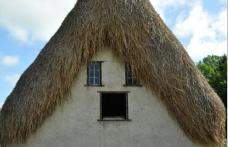 Starodawny Akcent. Dach w kształcie trójkąta pokryty strzechą imituje włosy, a małe okna oczy i usta otwarte w niemym zdziwieniu.