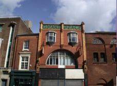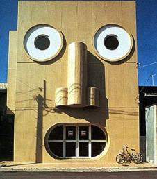 Miejska Twarz. Budynek jak każdy, z wyjątkiem wytrzeszczonych oczu w postaci wypukłych okien oraz buzi w podkówkę jaką tworzy duże, półokrągłe okno na dole.