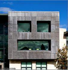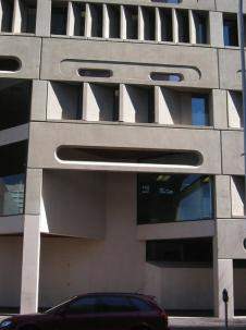 Biurowa Twarz. Proszę Państwa, oto twarz biurowego budynku! Zbudowana z szarych płyt oraz dużych okien w postaci oczu i ust.