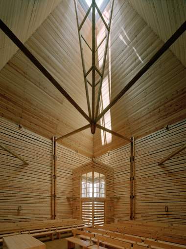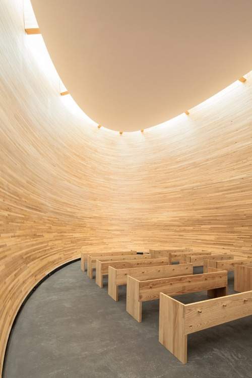 Wnętrze wypełnione światłem i drewnem, proste ławki, brak okien.