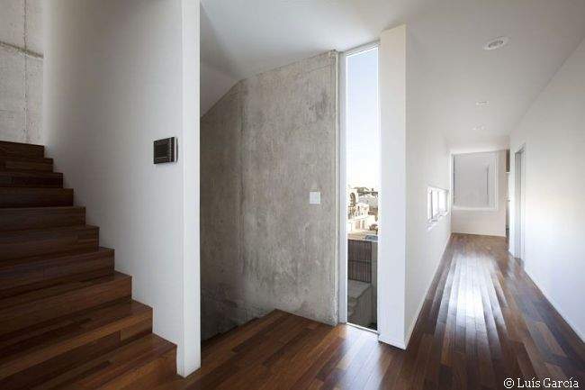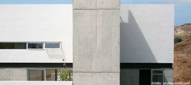 W zgodzie ze stylem całego budynku, 3. piętro – gdzie znajdują się sypialnie – powstało z betonowych bloków. Biała, gładka faktura idealnie komponuje się z resztą kolorów wykorzystanych w materiałach elewacyjnych zewnętrznej części budynku.