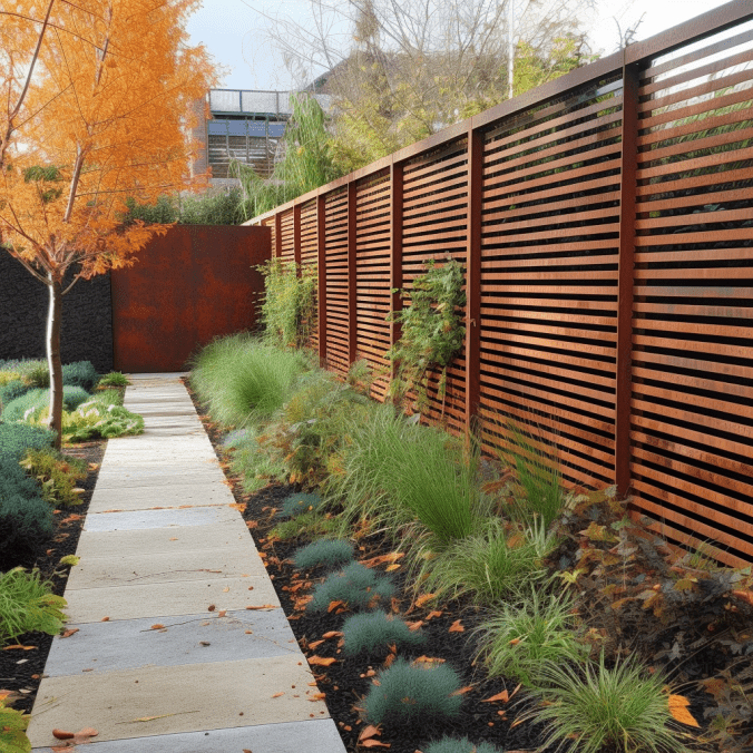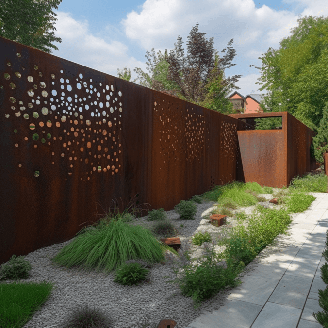 Tablica ogrodzeniowa ze stali corten z perforacją, nowoczesne rozwiązania architektoniczne, wytrzymała i estetyczna, idealna do ogrodów i przestrzeni miejskich.