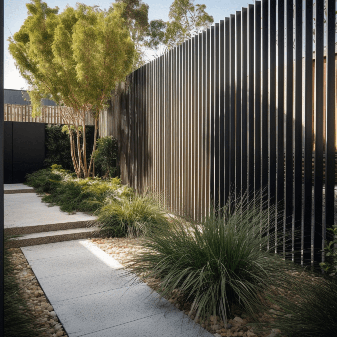 Nowoczesny ogród z czarnym ogrodzeniem i zielonymi roślinami, elegancka aranżacja przestrzeni outdoorowej, minimalistyczny design, zielona alejka, nowoczesny styl ogrodu, architektura krajobrazu.