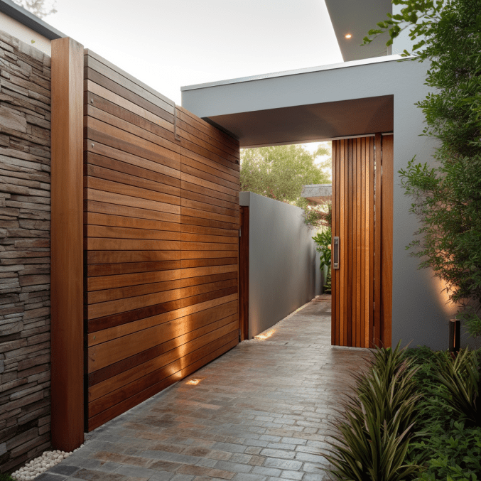 To nowoczesne ogrodzenie domu to mix dwóch nowoczesnych materiałów: stal korten została tutaj zestawiona z drewnem w podobnym odcieniu. Zwróć uwagę na efektowne podświetlenie całości.